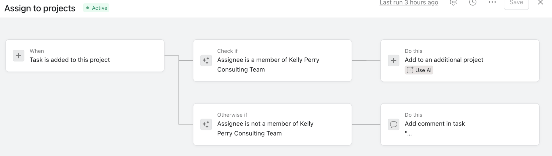 To solve for the breakage and upkeep issues Jeremy was experiencing, we added a new check-if phase that would validate whether the assignee was added to the team. If the assignee was no longer on the team, AI Studio would leave a comment to flag that the task was not moved. This also eliminated the scenario where a user would be added and assigned a task before Jeremy could manually update the rule.