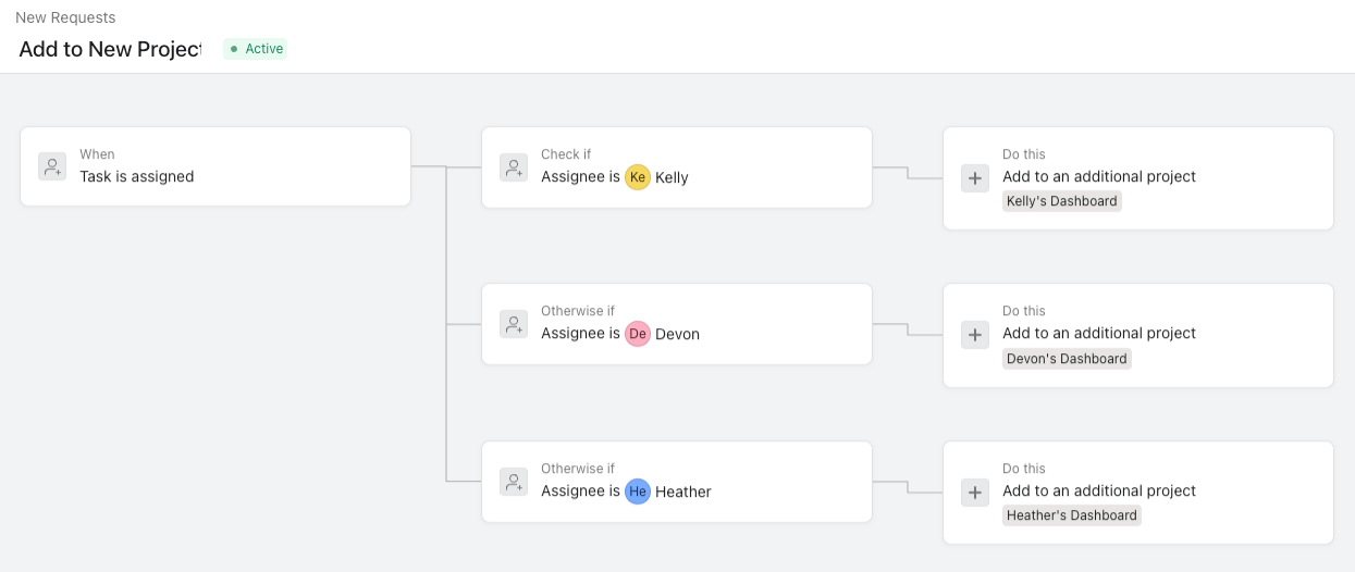 In the rule below, we are dynamically adding tasks to their corresponding project based on the assignee. In this example, we only have 3 branches, but let’s say I’m replicating this for a team of 20. This approach requires significant upkeep, and holds a high risk of breakage. What happens if I forgot to add someone? What if someone leaves the company?
